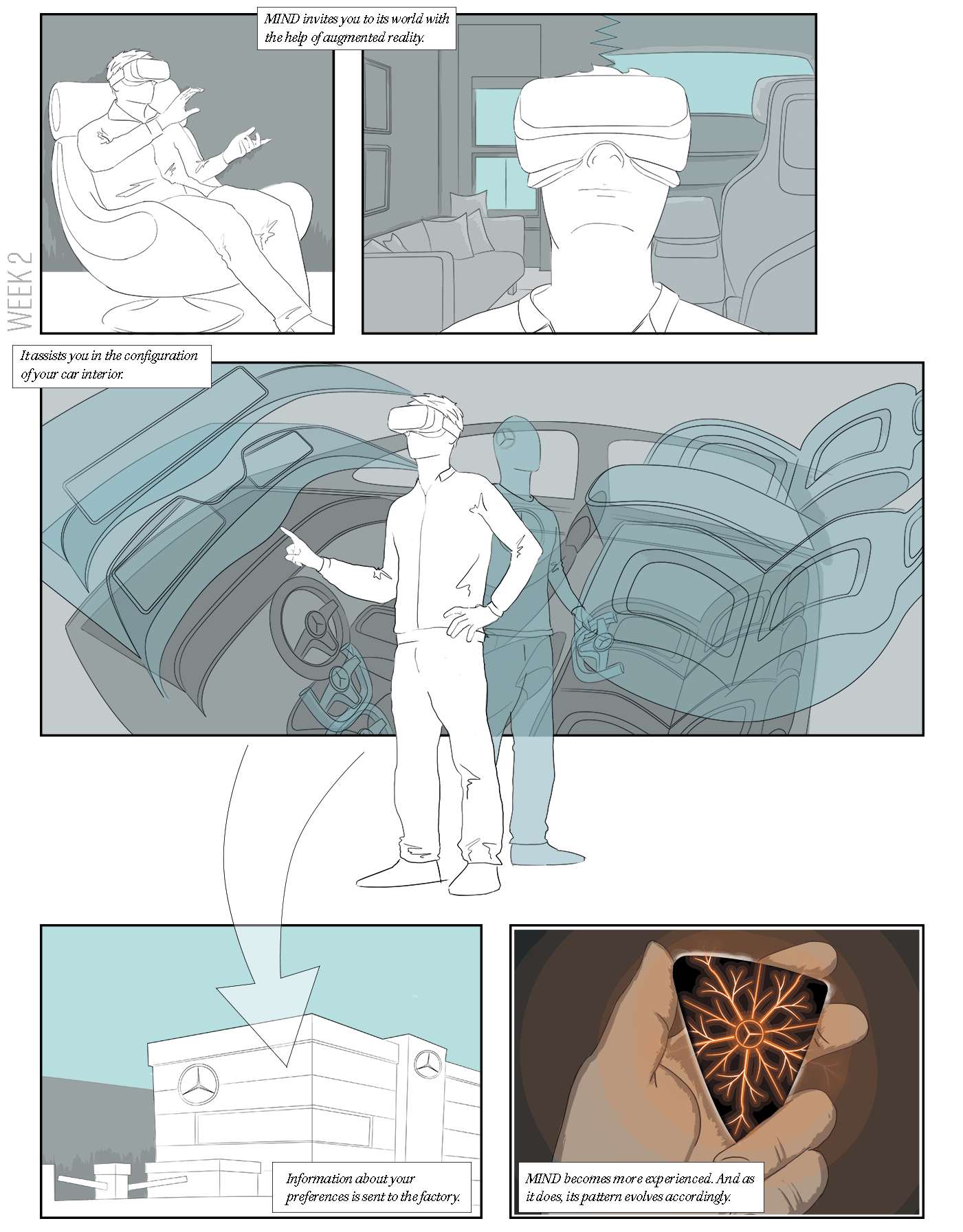 Mercedes-Benz is a premium car brand with a long and impressive history. For my master thesis I was tasked with creating an interior concept for Mercedes-Benz customers in 2035. Back in 2015, the automotive world was in the grasp of the autonomous vehicle revolution. Furthermore, AI was starting to peak over the horizon. The Mercedes-Benz customer, who tends to be more on the conservative side of innovation, this future vision provided friction. And for this friction I created a concept in which man and machine live in a symbiotic relationship, that ultimately provides more than the sum of its parts.