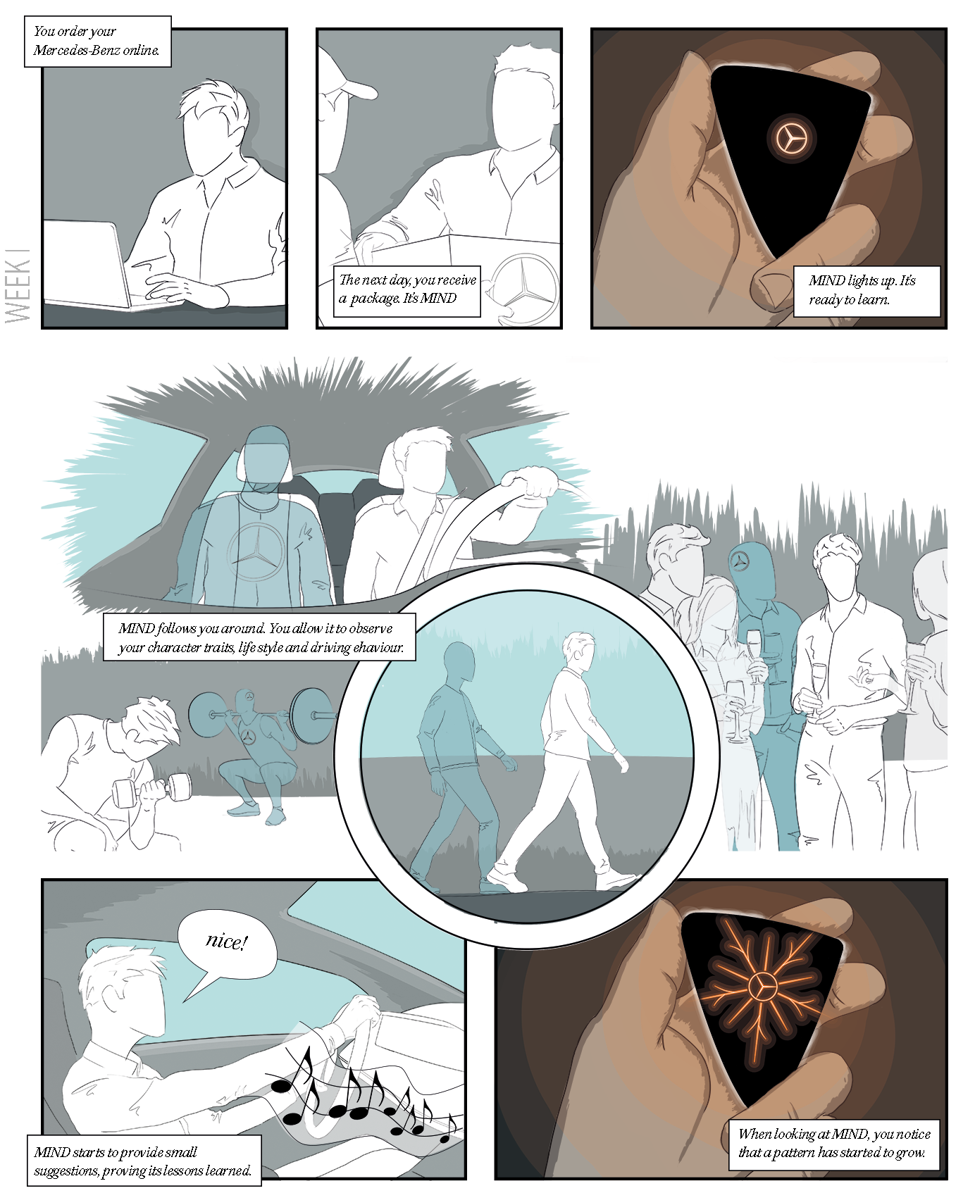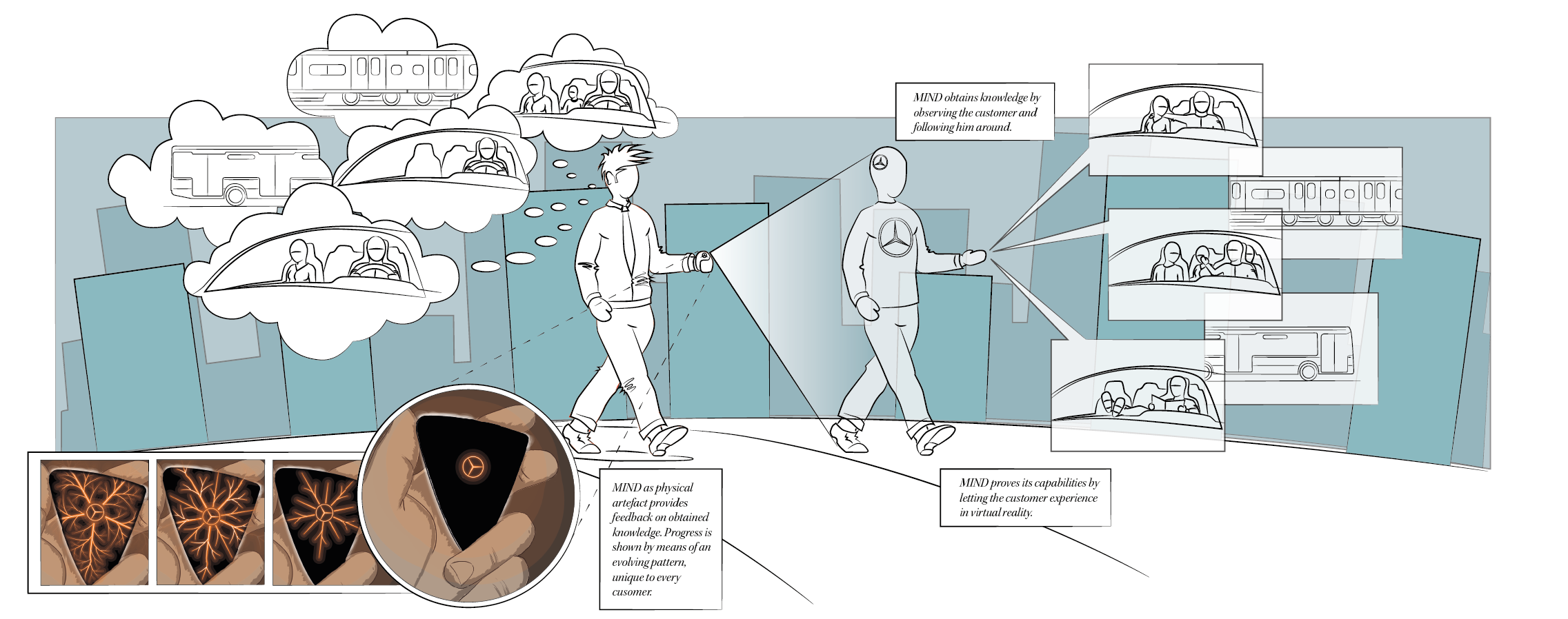 Mercedes-Benz MIND is a concept that introduces the AI of the car at the beginning of the user journey. Since Mercedes-Benz cars are made to order, there is a certain amount of waiting time after ordering. The AI is shipped to the customer in the form of a physical artefact. During the time it takes to build the car, the user and the car get to know each other. Much like the German Shepherd in the analogy, the owner trains the AI by having it accompany him through daily life, whilst learing it’s owner’s preferences. An unique and evolving graphical pattern shows the increasing sophistication of the AI.